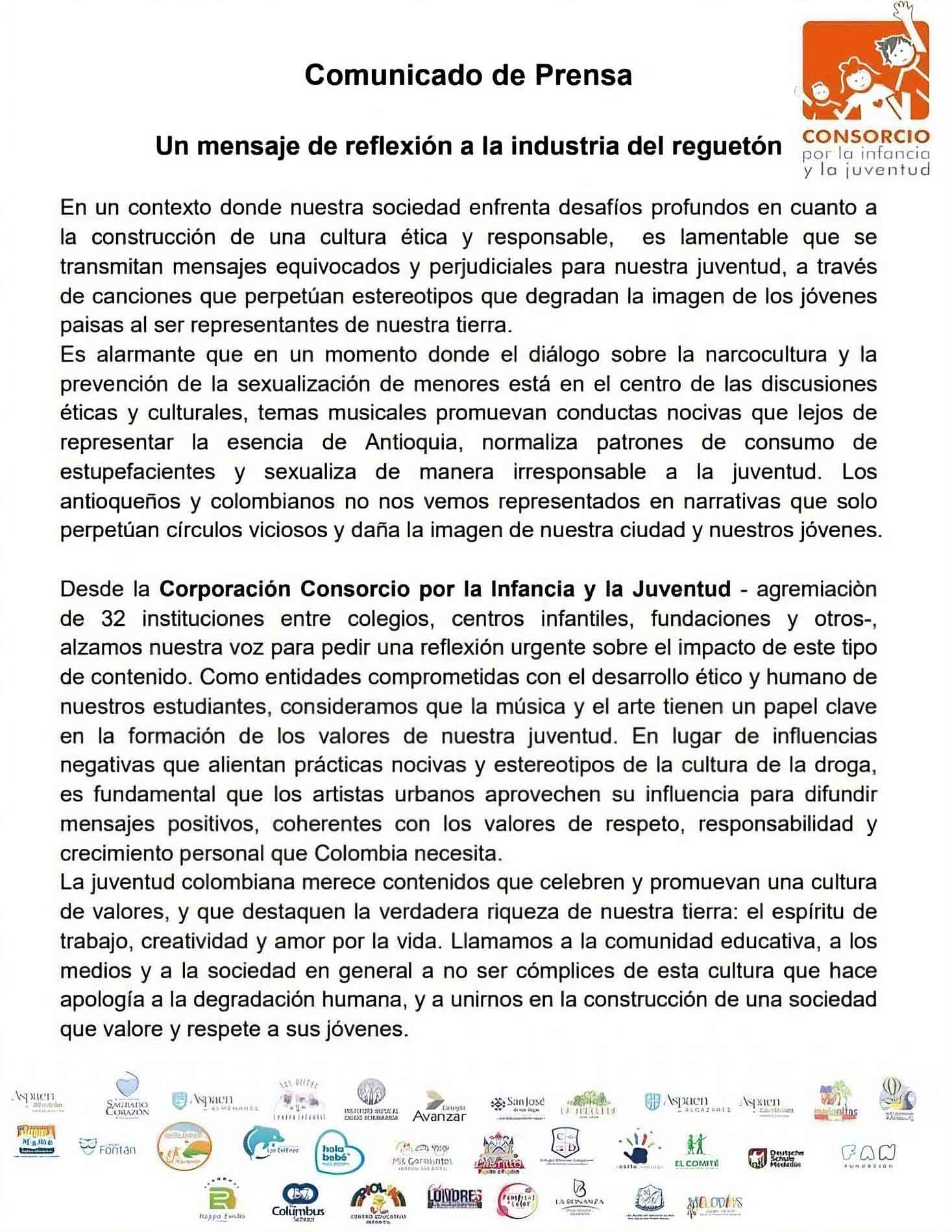 Este pronunciamiento se da por el lanzamiento de la canción de reguetón +57, en la cual cosifican a las adolescentes e hipersexualizando su apariencia y presencia en diferentes escenarios sociales.